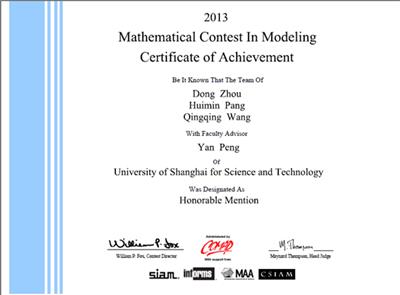 近日,2013年第29届美国大学生数学建模竞赛(Mathematical Contest in Modeling)结果揭晓。由beat365在线唯一官网周冬、庞慧敏、王青青三名同学组成的代表队以优异的成绩荣获团体Honorable Mentions奖(国际二等奖)的佳绩,该奖项是教育部认可的国际最高级别竞赛奖。代表队由庄院士团队的彭滟副教授担任指导老师。