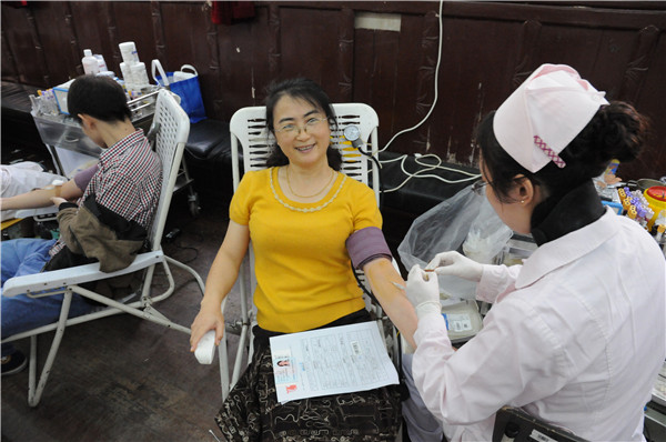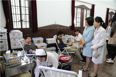 偿献血。我院分党委书记朱莉、副书记曹英来到现场慰问参加献血的师生。