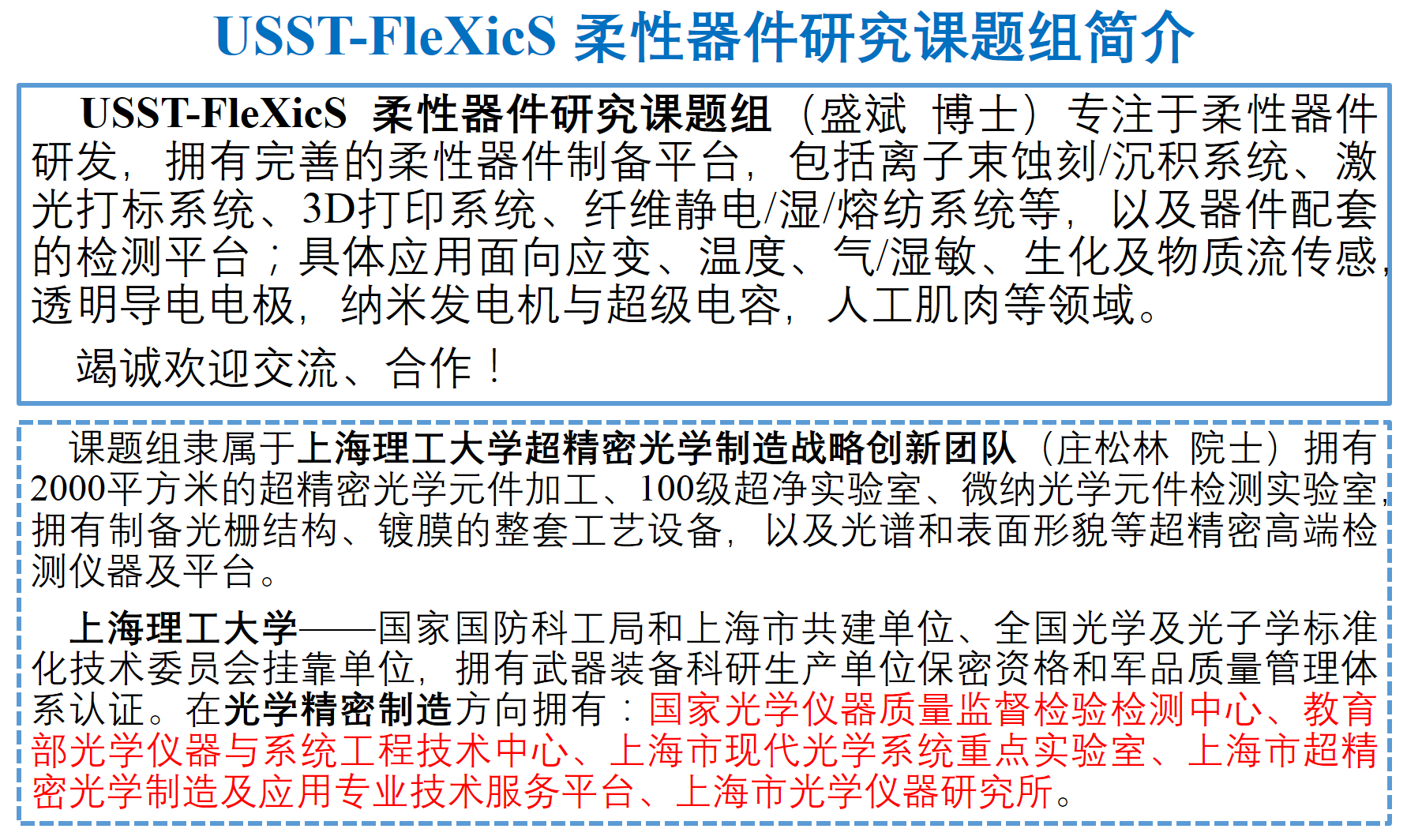 主要研究柔性器件制备和应用,完成国家自然科学基金1项,目前承担上海市自然基金面上项目1项。在ACS Applied Materials & Interfaces, Sensors & Actuators B: Chemical, Nanoscale, Soft Matter, Optics Letters, Applied Optics, Review of Scientific Instruments, IEEE Photonics Technology Letters, IEEE Photonics Journal, Chinese Optics Letters, Polymers, Materials, Applied Sciences等期刊发表论文30余篇,获授权发明专利10余项。指导硕士研究生20余人,其中3人次获得国家奖学金,3人次获得beat365在线唯一官网优秀毕业生荣誉称号,1人次获得beat365在线唯一官网优秀学位论文,1人次获得上海市优秀毕业生荣誉称号。
