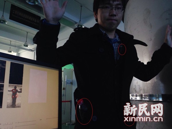 图说:研究人员现场演示,衣服口袋里的液体、手机和大衣内侧的塑料手枪清晰可见。红圈标注为“危险品”与扫描图的对应。新民网记者 李若楠 摄