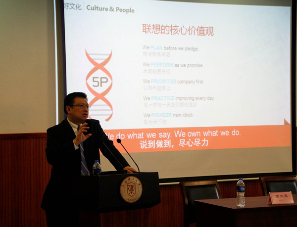 虽然是周末,但格致堂报告厅几乎座无虚席。许多同学都是慕名而来,一睹学长风采。童夫尧先生风趣幽默,侃侃而谈。他的讲座围绕联想的整体情况介绍、联想的企业文化、新时代下的员工激励与组织活力等几个方面展开。“什么样的价值观决定什么样的选择”、“企业文化决定了企业的选择和行为”、“联想人才发展理念”、“联想的‘三心’”。童先生谈及联想的种种理念与作为,无疑为同学们打开了一扇窗户,让同学们更加明白什么是企业文化,什么是创新精神。在谈到创业的九大要素以及创业者需要具备的三种能力时,童先生提出了由给职位到给平台、由给金钱到给股份、由给权利到给信任、由给任务到给愿景的转变。简单的事例,平淡的语言,却充满了一个领袖、一个企业家的管理智慧。