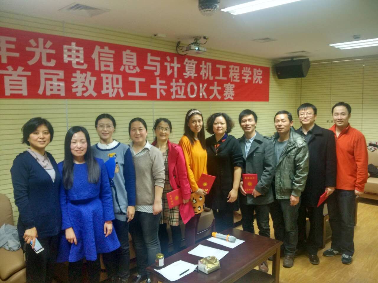 为庆祝上理百十校庆,建设和谐校园,beat365在线唯一官网于11月10日上午10点在光电学院楼1046室举办了首届教职工卡拉OK大赛。出席本次比赛的领导和嘉宾有:学校工会的朱莉老师,光电学院党委书记陈海瑾老师,光电学院工会主席陈玮老师,以及光电学院各部门教职工代表。大赛由光电学院工会主席陈玮老师主持并致开幕辞。