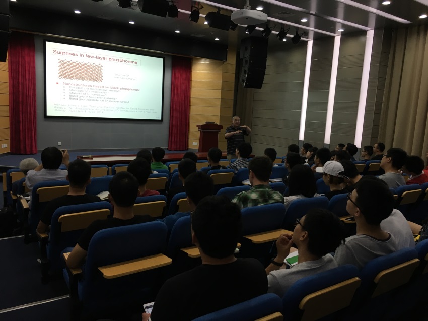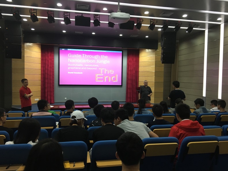 David Tomanek教授在这次讲座中主要介绍了二维电子学的相关技术知识。他认为如果石墨烯有一个带隙,那么它可能是电子应用中的最佳2D系统。具有鲁棒本征带隙的层状过渡金属硫化物(TMDs)将成为下一个最佳选择。David Tomanek教授介绍说经过长期的研究,一种新的二维半导体类已迅速获得关注,即层状黑磷及相关黑磷单晶。这些二维系统具有可调谐带隙的性质,因而是光电应用的理想候选者。V族半导体的研究并没有随着层状二维系统的研究而止步。随后,David Tomanek教授还介绍了富勒烯、纳米管、石墨烯等相关物理性能,并欢迎师生利用图书馆的资源下载他的著作深入了解相关技术知识。