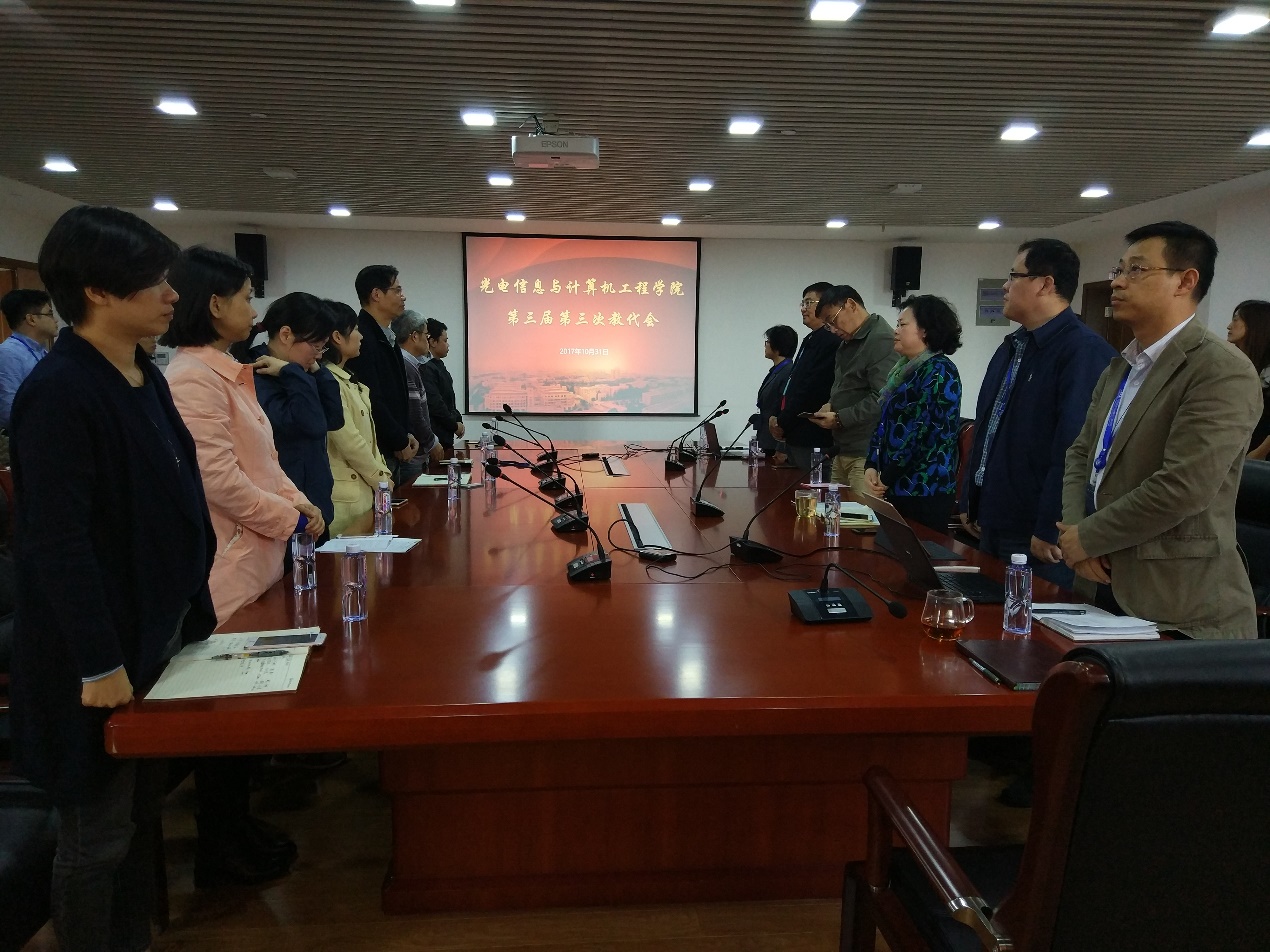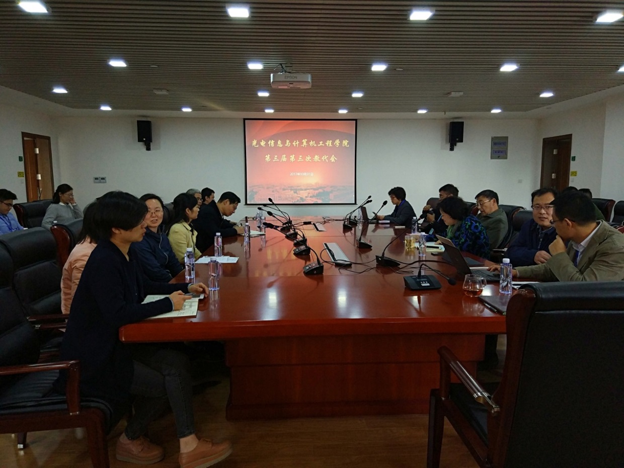2017年10月31日下午,beat365在线唯一官网第三届第三次教代会在新光电楼1042会议室顺利召开。参加本次会议的正式代表应到48人,实到38人,符合开会和换届选举条件。会议由学院工会主席陈玮主持。