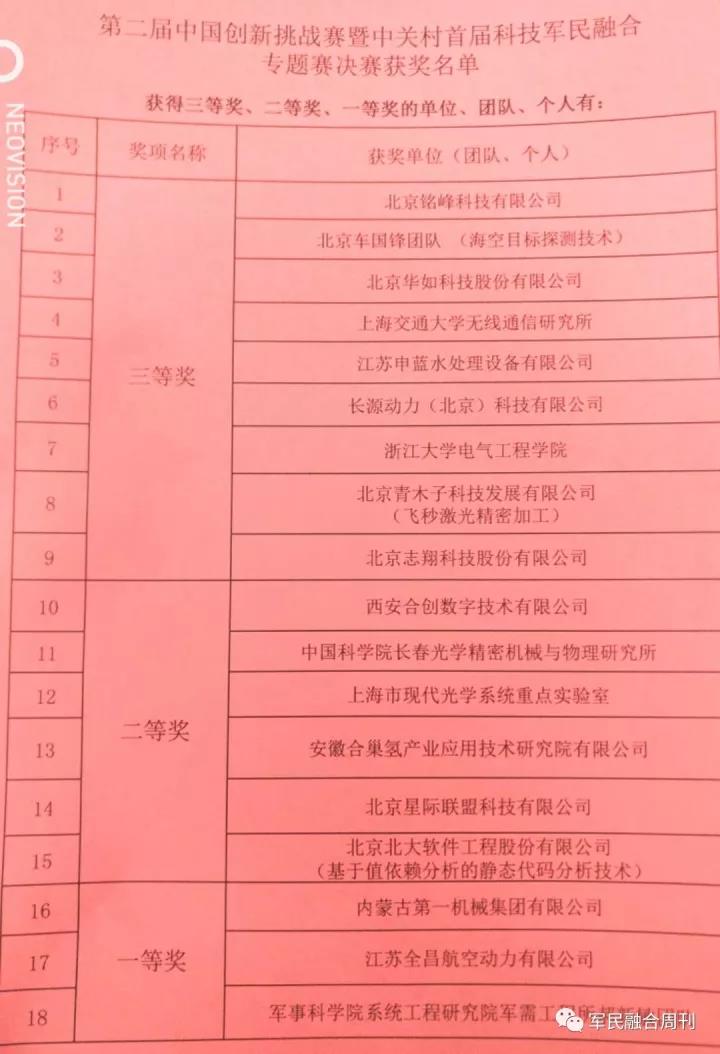 获奖名单(军民融合周刊 摄)