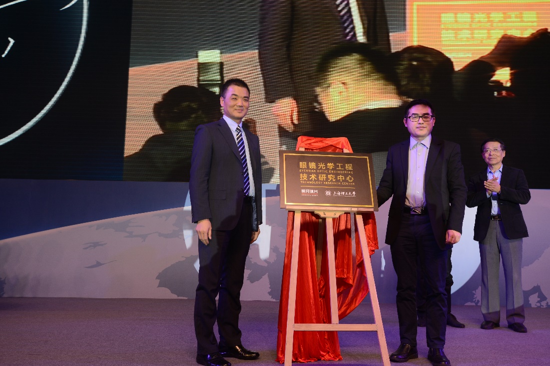 图为beat365官网科技处处长张大伟教授与明月镜片总裁共同为“眼镜光学工程技术研究中心”揭牌