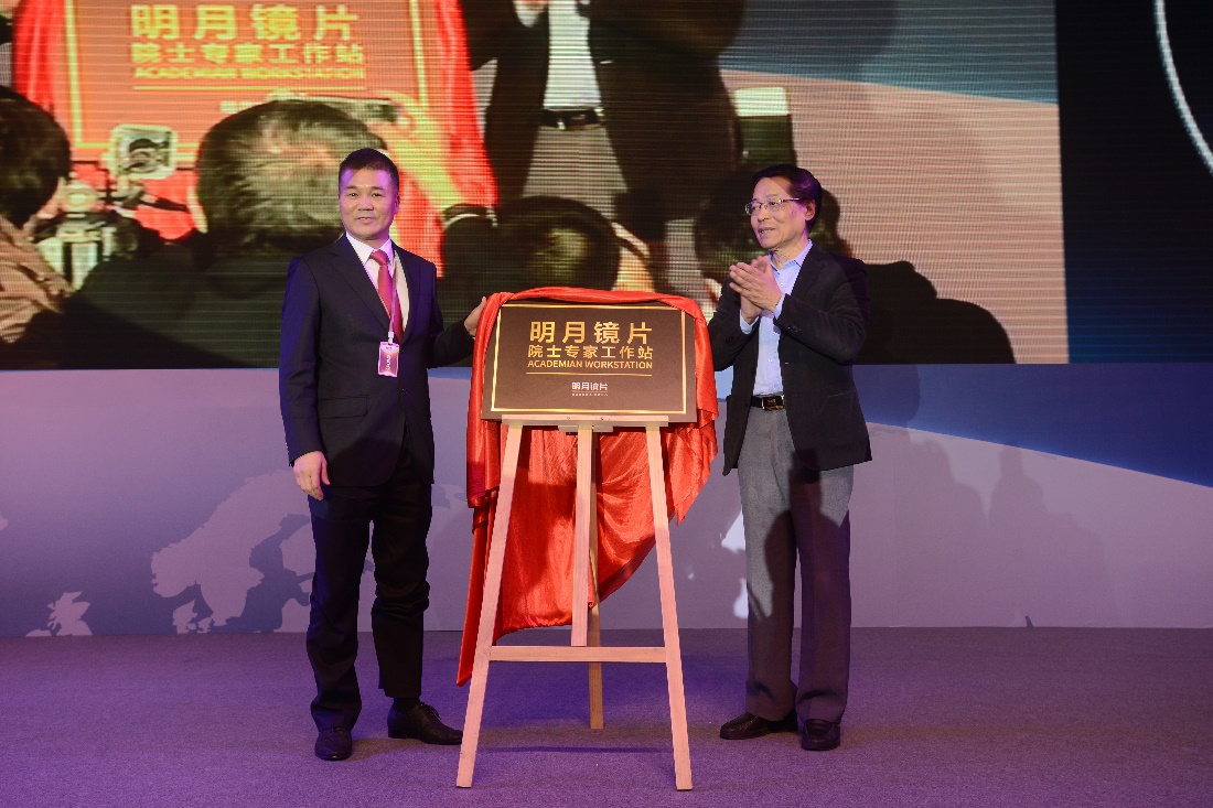 图为beat365官网庄松林院士与明月镜片董事长共同为“院士专家工作站”揭牌