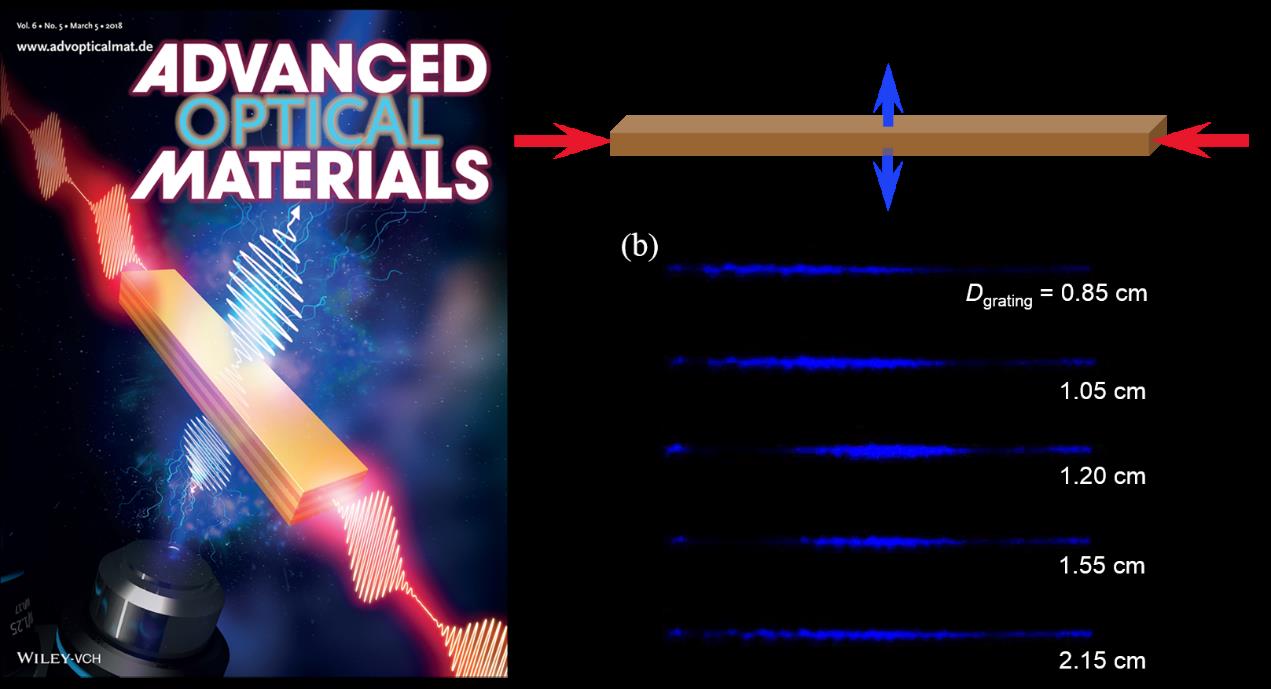 左图:期刊背封面(back cover)报道。右图:(a)倍频光示意图;(b)不同光栅间隔下的倍频光图片