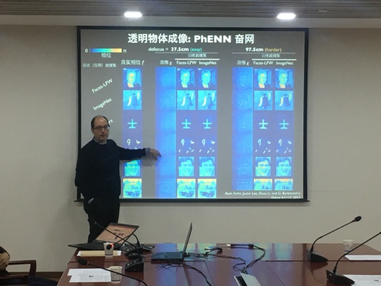 蓝明光教授详细介绍了他们的研究团队关于结合人工智能与物理增强的手段,对低照度环境下的不可见物体进行成像的研究成果。具体包括利用相位提取神经网络运算(Phase Extraction Neural Network, PhENN)对不可见物体的成像,以及利用散射效应对物体内部的成像。随后,光电学院刘一教授和人工智能纳米光子学中心副主任张启明教授分别向蓝明光教授介绍了beat365官网光电学院及人工智能纳米光子学中心的建设和研究情况。学术报告结束,蓝教授和袁文达先生一行在庄院士等学院领导的陪同下,参观了光电学院分析测试中心、太赫兹技术创新研究院及人工智能纳米光子学中心实验室。