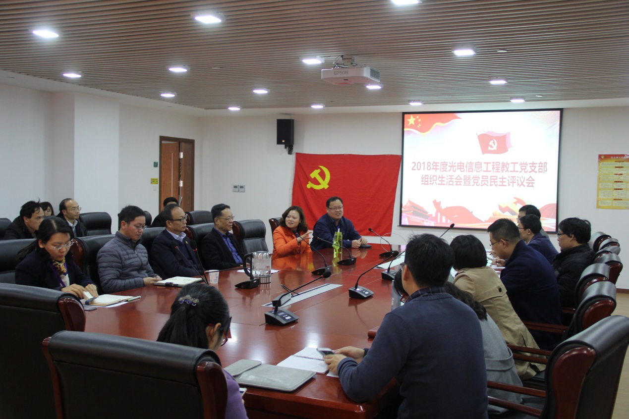 光电学院光电信息工程教工党支部于2019年3月12日下午在光电楼1042会议室召开了专题组织生活会,并开展了党员民主评议。该党支部2018年度入选教育部党建样板支部,支部案例入选教育部《基层党组织书记案例选编(高校版)》。副校长刘平、组织部副部长李杰、光电学院党委书记陈海瑾、副院长刘伟等领导到会观摩指导,包括庄松林院士在内的全体支部党员到会参加活动。会议由支部书记冯吉军主持。
