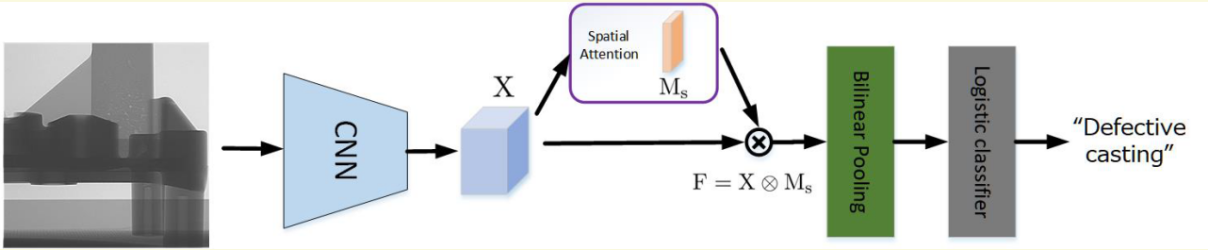 汤振辉同学在IEEE Transactions on Industrial Informatics期刊上发表名为 “Non-Destructive Defect Detection in Castings by Using Spatial Attention Bilinear Convolutional Neural Network”( 基于空间注意力机制双线性卷积神经网络铸件无损检测研究)的研究论文。该论文提出来一种新的CNN模型结构和空间注意力模块,利用深度可分离卷积减少跨通道和跨空间的相关性,能够直接对射线图像中的铸件进行缺陷检测,减少了大量的人工标注负担,使得基于射线的缺陷检测系统更加实用, 大幅度提高了无损检测的性能。图4和图5是基于双线性池化和空间注意力的CNN模型架构和模型预测的可视化分析。(论文链接:https://ieeexplore.ieee.org/document/9057424).