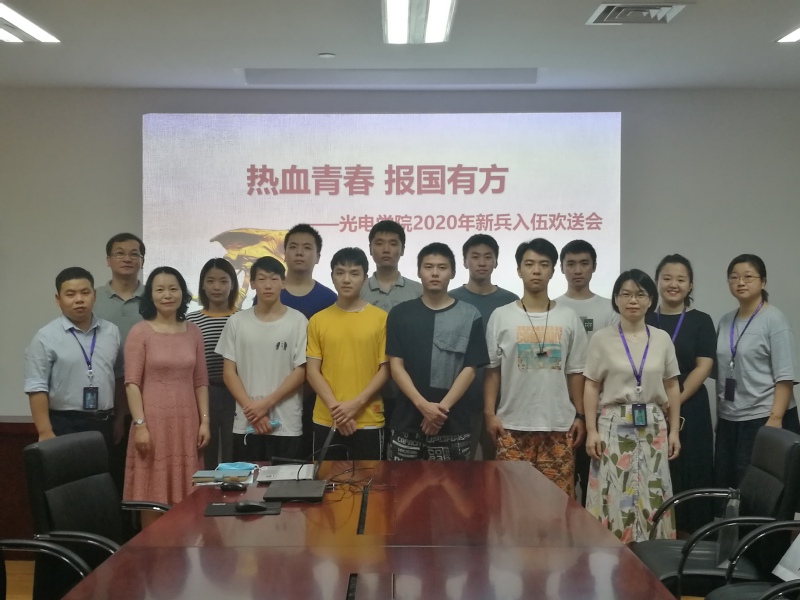 9月8日上午,光电学院2020年大学生新兵入伍欢送会在光电楼1026会议室举行,光电学院党委副书记曹英,辅导员代表,退伍老兵代表,以及全体八位应征新兵出席了欢送会。
