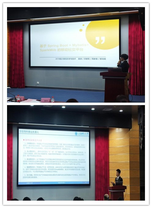在何可副书记致辞后,大赛进入答辩环节,决赛项目组答辩选手依次上台展示作品,并由评审团指导老师点评打分。最终,经过了三个小时的激烈角逐,“新能力杯”赛场中,“智能物料搬运机器人”项目组与“ 基于Spring Boot + Mybatis+ SparkMlib的移动社交平台”项目组获得特等奖。“勤志杯”赛场中,“基于语音识别系统的多功能摄像头”项目组获得一等奖,“基于STM32的智能搬运小车”项目组、“法小通—大众法律智能援助服务”项目组获得二等奖,“职言职语-大学生职业规划智能平台”项目组、“基于Zemax的菲涅尔透镜设计”项目组以及“基于子网络级联式混合信息流的显著性检测”项目组获得三等奖。