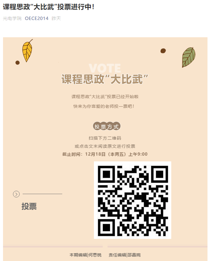 为深入贯彻党的十九大精神,落实《高等学校课程思政建设指导纲要》,进一步探索“三全育人”和“课程思政”的有效途径,根据“2020年度beat365在线唯一官网课程思政教育教学‘大比武’活动”要求,光电学院开展了课程思政教育教学“大比武”活动,活动以线上投票和线下选拔相结合的方式进行。