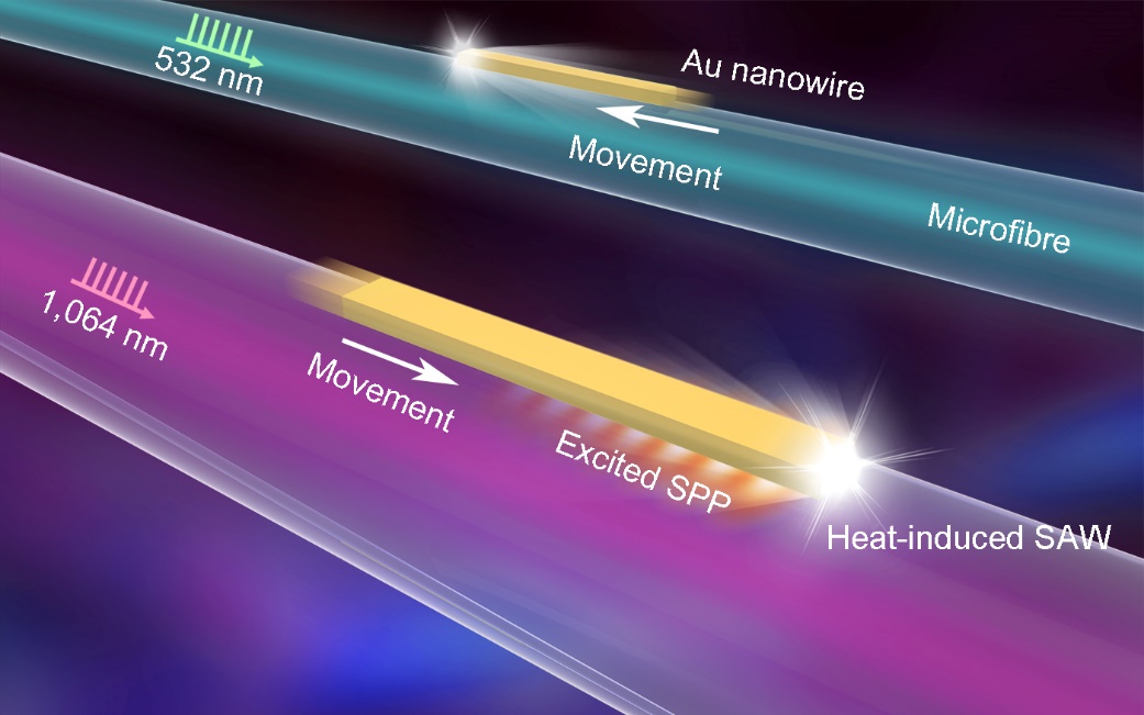 图1. 等离激元驱动的金纳米线在二氧化硅微纳光纤运动示意图。展示了分别由波长为532 nm和1064 nm的脉冲激光驱动金 纳米线在悬空微纳光纤上的运动。其中只有1064 nm的脉冲激光才能有效地激发金纳米线中的表面等离激元,从而增强吸收光的热效应,并诱导产生表面声波驱动金纳米线沿二氧化硅微纳光纤运动。