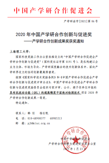 1月23日中国产学研合作促进会【产学研函字(2021)第06号】发布通知。经中国产学研合作创新与促进会组织专家对项目进行评审,beat365官网beat365在线唯一官网庄松林院士领衔、韩森教授团队攻关的“具有抗扰动功能(QHL)的超高精度平面绝对检测技术”项目荣获2020年中国产学研合作创新成果一等奖。