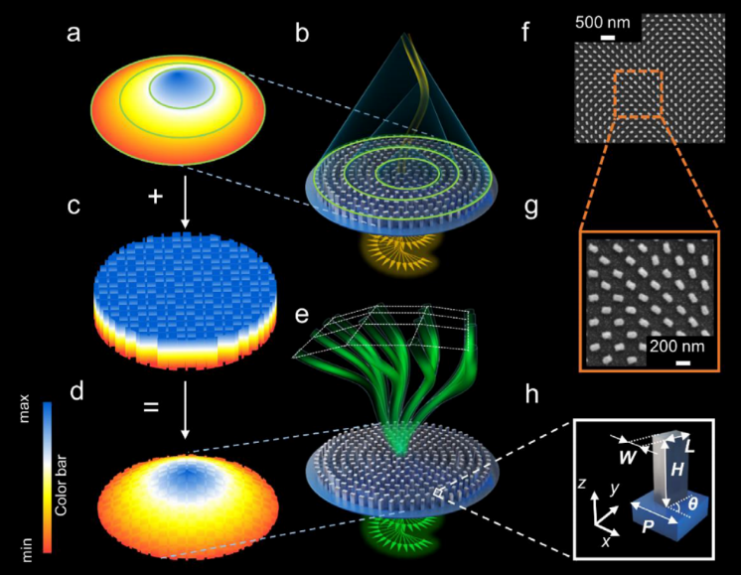 类贝塞尔光束是沿着特定曲线轨迹传播的无衍射光束。传统的类贝塞尔光束发生器(如空间光调制器)不仅体积大,衍射效率低,而且限制了光束的最小尺寸和弯曲的最大曲率。张大伟课题组使用介电超构表面,实现了具有亚波长横向尺寸、大弯曲程度的自加速类贝塞尔光束,可在550 ~ 710nm的宽带光谱范围内生成具有预定义任意轨迹的单个类贝塞尔光束以及携带OAM(轨道角动量)的类贝塞尔涡旋光束,这些光束有非线性抛物线和余弦振荡轨迹,NA高达0.79,从而使类贝赛尔光束的宽度降至接近衍射极限的尺度即234nm(~0.43λ)。以上成果丰富了自加速光束的多样性,并为自加速光束在光存储、微粒或活细胞操控、生物医学成像以及材料激光加工等领域的应用发挥重要作用。成果于2021年3月发表在Laser & Photonics Reviews上(影响因子:10.655,中科院一区,国际TOP期刊),题目是“Use of Dielectric Metasurfaces to Generate Deep-Subwavelength Nondiffractive Bessel-Like Beams with Arbitrary Trajectories and Ultralarge Deflection”(利用介电质超构表面产生具有任意轨迹的亚波长横向尺寸且大弯曲程度的类贝赛尔光束)。上理工文静副教授为论文的第一作者,2020级陈磊同学为共同第一作者,张大伟教授和香港城市大学雷党愿教授为共同通讯作者。