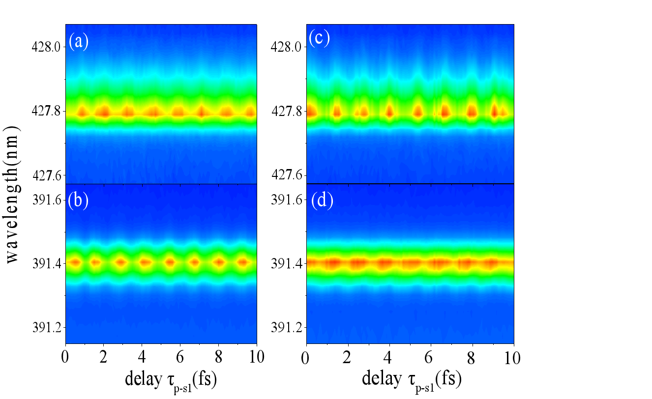 图2.427.8nm和391.4nm附近光谱强度随泵浦脉冲与种子脉冲391.4nm(τp-s1)时间延时的变化。