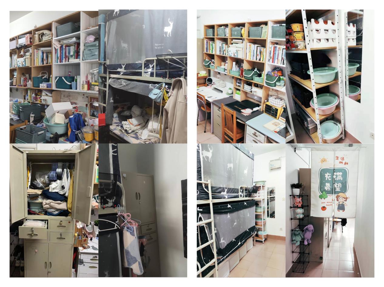 12月5日,寝室成员们先将自己的物品全部陈列出来,“断舍离”后就开始在收纳老师的指导下进行分类、折叠、收纳、放置,用时六小时打造出大家梦想中的寝室。“从来没想过我们寝室居然也能这么大”、“想邀请所有人来我们寝室参观,我得先发条朋友圈炫耀一下”、“在这样的环境中学习生活心情都好很多,不过更重要的是要督促自己保持下去”……同学们看着自己的劳动成果都很兴奋。