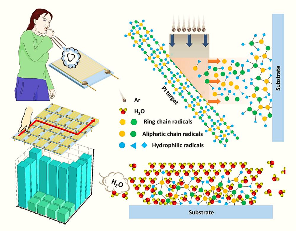 超高灵敏湿度传感器可用于生命体征检测或非接触感应,在人工智能、生物医学领域具有巨大的应用潜力。团队创新性地提出一种对聚合物靶材进行离子束溅射沉积,制备聚合物湿敏薄膜的通用方法,成功以聚酰亚胺为溅射靶材制备了高灵敏湿敏薄膜,并系统研究了其成膜机制和传感机理。新型传感器在10-95%的相对湿度范围内具有超高灵敏(电容值变化超过40000倍),快速响应(~1s),迟滞小和稳定工作时间长等优异特性,实现了非接触感应,并对人体呼吸的深浅程度和频率等信息进行实时监测,同时也可以检测植物叶片气孔的开闭状态。研究还制备了5×5规格的新型传感器阵列,成功记录被试者手指悬空划过的轨迹并可以较准确的反映出潮湿物体的形状。该研究成果提供了制备湿度传感器的新思路,新型聚合物湿度传感器有望应用于生物体呼吸监测和无接触感应等领域。