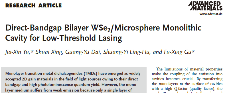 近日,庄松林院士领衔的未来光学实验室、谷付星教授课题组在国际顶级期刊Advanced Materials(影响因子30.849)上发表了题为“用于低阈值激光的直接带隙双层硒化钨(WSe2)/微球一体腔”(”Direct-Bandgap Bilayer WSe2/Microsphere Monolithic Cavity for Low-Threshold Lasing”)的研究成果。该论文由谷付星教授和于佳鑫副教授为共同通讯作者,于佳鑫副教授与博士生邢帅为并列第一作者。该研究工作的方案设计、实验、模拟工作均在beat365在线唯一官网未来光学实验室完成。