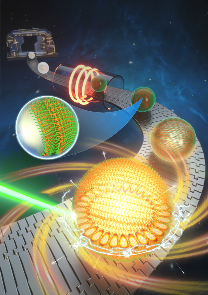 近年来,光子集成芯片因具有响应速度快、频带更宽、线路损耗更低等优势,被认为是未来高性能集成芯片的有力竞争者。微纳激光器件最为其重要组成部分之一,常常受制于功耗过高和加工成本高昂等问题。微球是一种优异的光学微腔结构,在泵浦光的激发下可以产生高品质因子的回音壁模式振荡,在微纳激光、光学传感等领域均获得广泛关注。相比于其他需要高精密加工技术的常见微腔(如F‒P微腔、WG微腔、光子晶体微腔等),微球可以通过批量工业生产来获得,是一种低成本、高产率、重复性好的微腔选择;若利用单层过渡金属硫族化合物作为增益介质,其单分子量级的材料厚度和极高的量子产率,在超高集成度、低能耗的微纳激光方面具有良好的工业实用前景。基于这一想法,集成光机电团队创新性的提出了将双层WSe2包覆沉积于微球表面,二者通过范德华力结合,在技术上有效的解决了脆弱的二维材料与复杂曲面的粘合性这一棘手问题;而沉积过程引入的材料曲面应变,巧妙的将双层材料的间接电子带隙转变为直接带隙,进而将光致发光强度显著提高近60倍;此外,这种增益介质/微腔的一体结构也大大提升了腔体对光的约束性。基于上述优势,研究人员实现了0.72W/cm2的超低阈值微纳激光,比现有激光阈值记录低近一个数量级。该研究成果首次证明了使用多层过渡金属硫族化合物作为二维增益介质的可能性,同时也为超紧凑激光器件提供了一种新的思路。