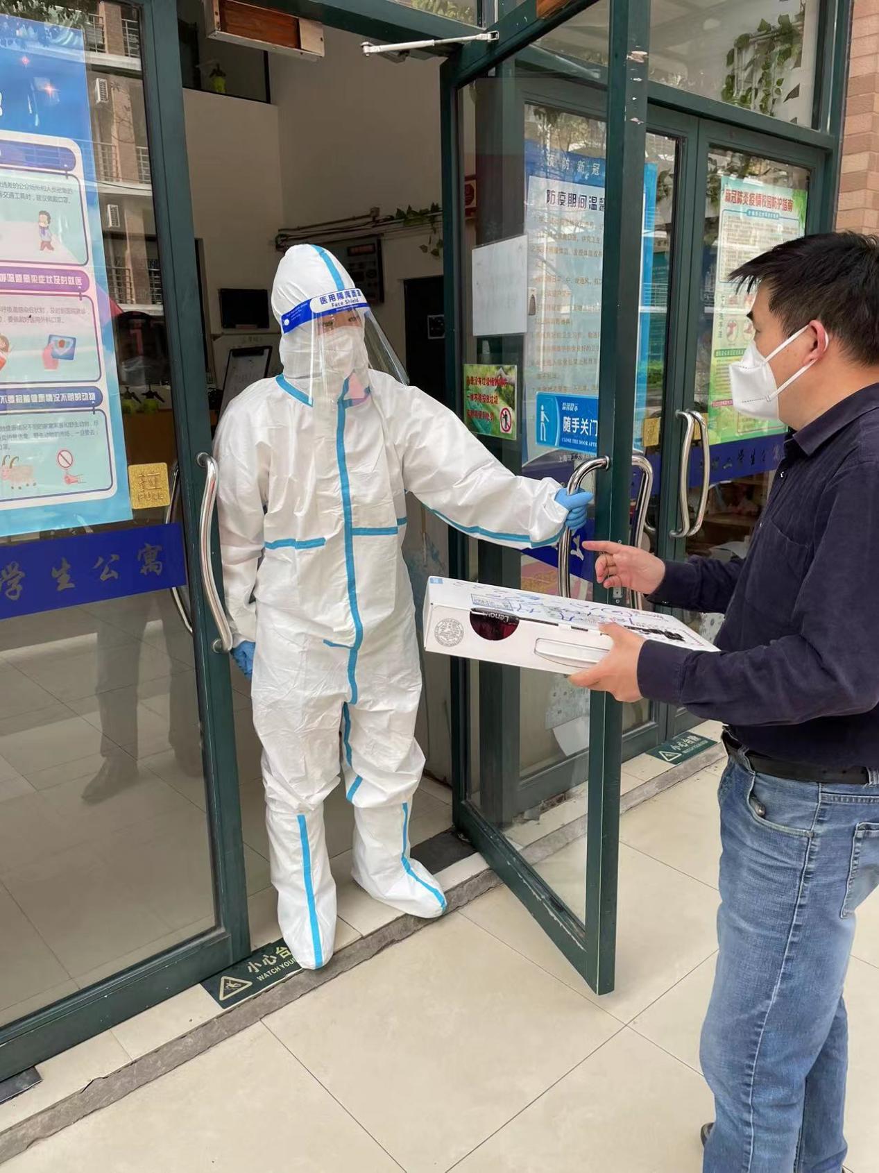 “58份居委保供蔬菜套餐,76提鸡蛋,20余袋面粉,106箱牛奶,这是我们小区一个普通下午的派送清单”。光电学院杨康文老师家住闵行区梅陇镇所在小区疫情防控压力大、老年居民比例高。小区封控期间,杨老师一方面坚持做好教师本职工作,通过腾讯会议、微信视频等多种方式指导学生修改论文讨论课题进展,为学生们的学习保驾护航;另一方面,积极主动参与社区志愿服务与小区党员和居民一起自发成立志愿者团队,参与到社区管理的繁杂事务中,配合居委分发保供套餐、运送各类物品。居民们日常生活所需的大量物资,在志愿者团队一趟趟肩扛手挑地运送下无一遗漏,及时地分发到居民手中杨老师以身作则带头参与志愿服务的精神,也感染了课题组的学生们,同学们在校内纷纷穿起防护服,抬起配送箱,主动融入宿舍的疫情防控工作中。研二学生李佳颖就是其中之一目前还是入党积极分子的她表示,受导师杨康文老师影响,从刚听到疫情传播时的担惊受怕,到面对疫情毫不犹豫穿起防护服,担当志愿者经历了巨大的蜕变与成长。