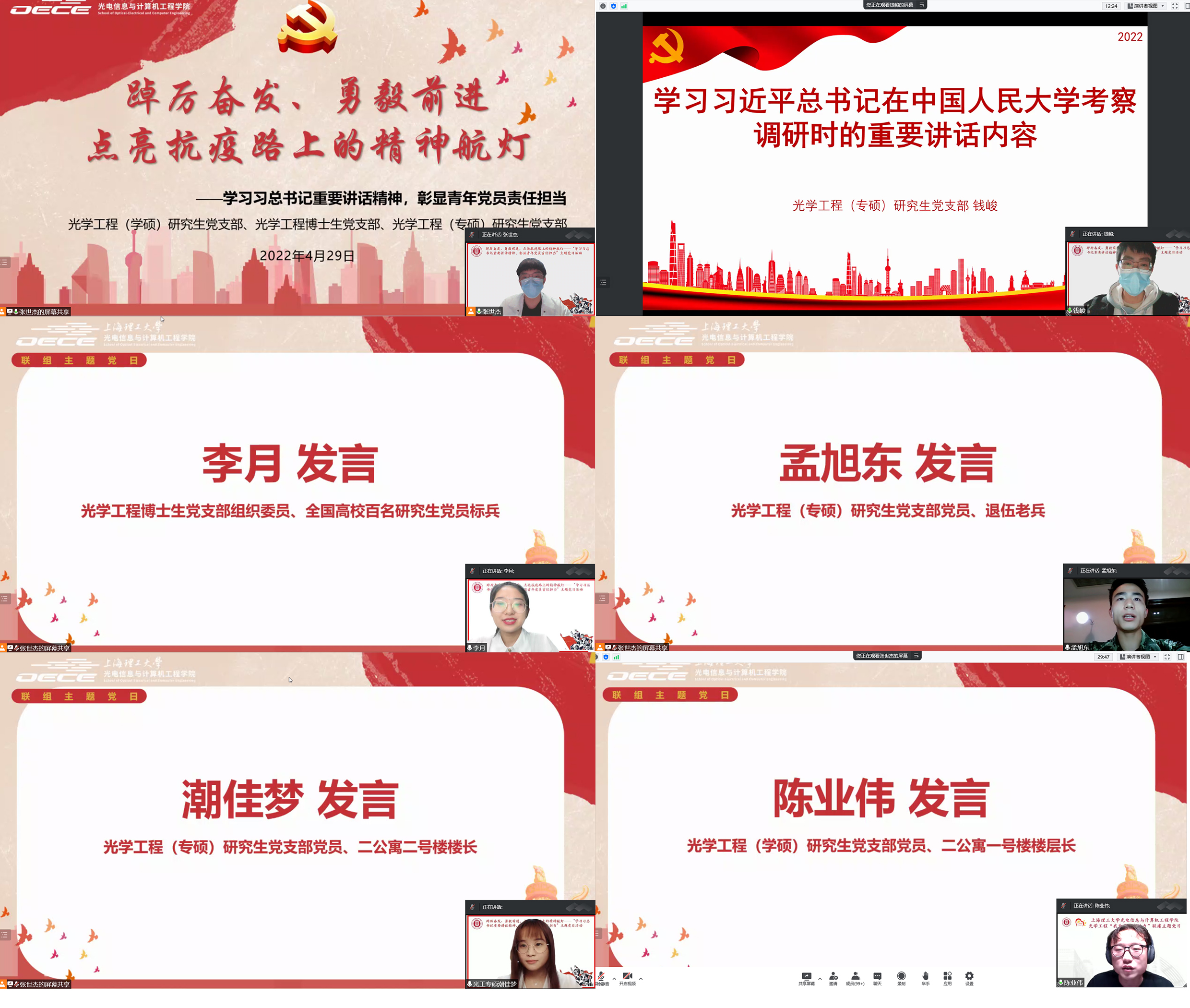 主题发言环节,全国百名研究生党员标兵、光学工程博士生党支部组织委员李月同志就封楼期间科研抗疫两不误的经历做了分享。作为宿舍楼的数据统计联络员和层长,从封楼至今已经在疫情一线连续坚持了20余天了,并且在这一个多月的时间内依然积极和导师保持良好的沟通,完成了SCI论文的返修,也收到了录用通知。她表示,作为青年党员,作为高校学生,我们应当以“不待扬鞭自奋蹄”的干劲,不断学真知,求真理,冲在创新发展的最前沿,把爱国热情转化为认真学习、积极上进、不断进取的不竭动力。同时, 在疫情严峻形势下,我们青年党员当以“不破楼兰终不还”的担当,承担起当下时代赋予我们的责任,积极投入到志愿服务工作中来,增强大局意识,主动亮身份、当先锋、作表率,用实际行动诠释“一名党员就是一面旗帜”。