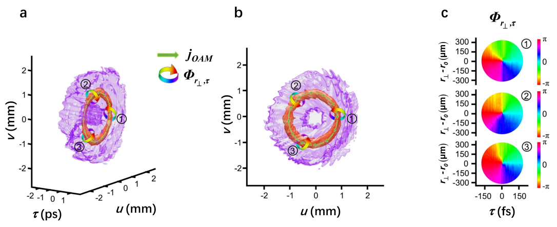 为了精确测量和表征光学涡环,从光源处分出一束参考光,并通过光栅对压缩成飞秒脉冲,这个飞秒脉冲大约90飞秒,在时间尺度上远小于待测的光学涡环。通过电控调节纳米台和自动测量程序,参考光分别与时空涡环的每一个时间切片进行干涉,通过CCD相机记录干涉条纹,重建光学涡环每一个时间切片的光场信息,进而构建如图3所示的整个光学涡环的等光强面分布和极向时空涡旋相位信息。实验结果验证了光学涡环具有中空环状光强分布和围绕环状涡线旋转的时空螺旋相位的特点。基于以上特点,可推导出光学涡环具有封闭环状的轨道角动量密度分布和围绕环状涡线旋转的坡印廷矢量分布。研究工作对光学涡环的传播也进行了初步的研究,包括在负色散介质中的稳定传播,以及在空气中长距离传播会发生分裂等现象。