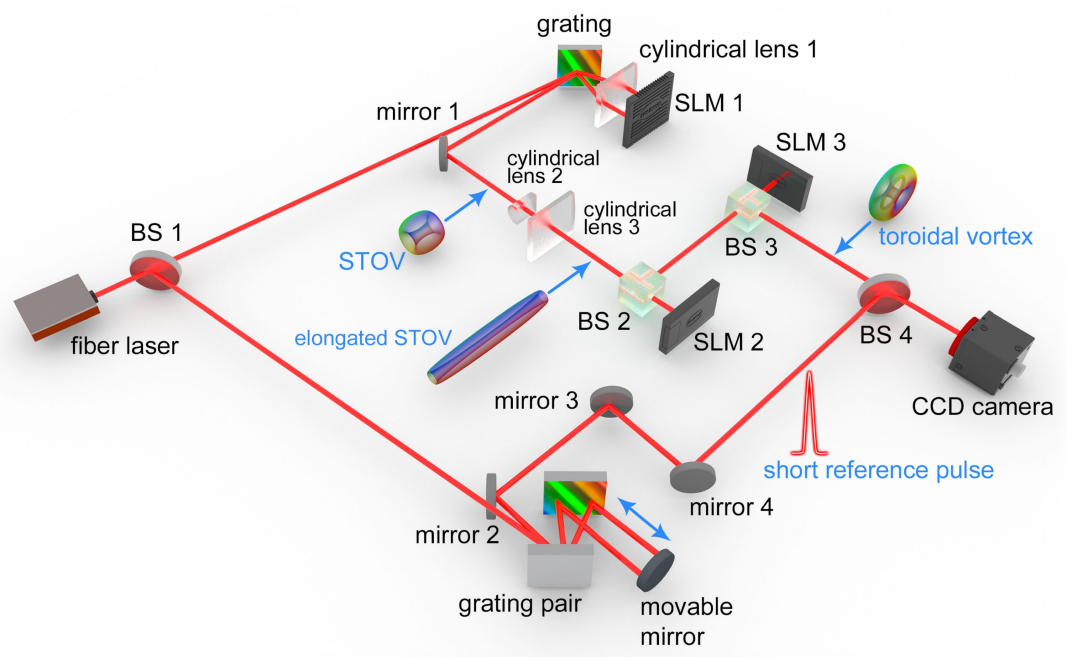 beat365在线唯一官网团队在该团队2020年发表于《自然·光子学》(Nature Photonics)“携带横向轨道角动量的时空涡旋光的可控生成”(Generation of spatiotemporal optical vortices with controllable transverse orbital angular momentum)工作的基础上开展了实验验证。图2所示为实验装置图。光源是一个发出皮秒啁啾脉冲的光纤锁模激光器。激光器发出的光脉冲经过由衍射光栅、柱透镜和液晶光调制器组成的二维脉冲整形器。通过液晶光调制器对入射光场施加一个可控的涡旋相位,可以将入射光转化为时空涡旋波包(STOV)。时空涡旋波包经过两个柱透镜组成的光学扩束系统,沿涡线方向拉伸成时空涡管。随后,由第二个和第三个液晶光调制器进行光学保角变换,分别施加变换相位和校正相位,将时空涡管映射成光学涡环。