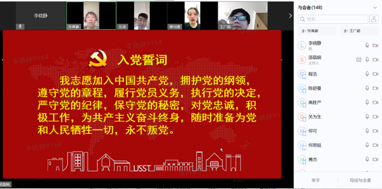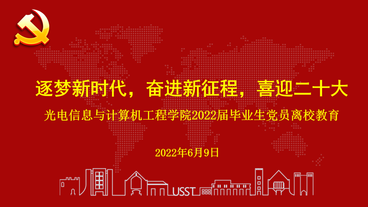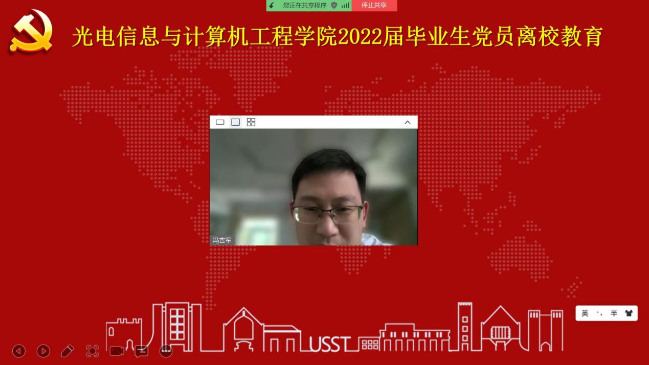 为深入学习贯彻习近平新时代中国特色社会主义思想,落实立德树人根本任务,抓好毕业生党员“出口关”教育和监督管理,激励全体党员同志以昂扬姿态迎接党的二十大胜利召开,6月9日上午,光电学院党委以“逐梦新时代,奋进新征程,喜迎二十大”为主题组织开展了2022届毕业生党员离校教育活动,活动采用线上会议形式。学院党委副书记何可、光电信息工程教工党支部书记冯吉军、全体毕业班辅导员、专职组织员邵晶婉以及全体毕业生党员参加本次活动。活动由学院专职组织员邵晶婉主持。