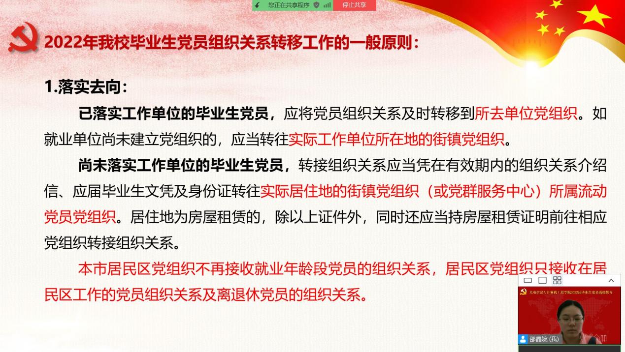 毕业生党员组织关系转移是毕业生党员最为关心的内容,也是毕业环节中尤为重要的一环。为了帮助毕业生党员妥善处理各事项,专职组织员邵晶婉结合上级有关规定和工作实际,从党员组织关系的转接概念、转接流程、转接去向、转接方式、时间安排等方面,为广大毕业生党员做了系统介绍。针对党组织关系介绍信、档案滞留等重点环节进行了细致的解答,强调了介绍信信息准确的重要性及在规定时间内完成党组织关系转接工作的严肃性,使毕业生党员在办理组织关系转接时做到心中有数。