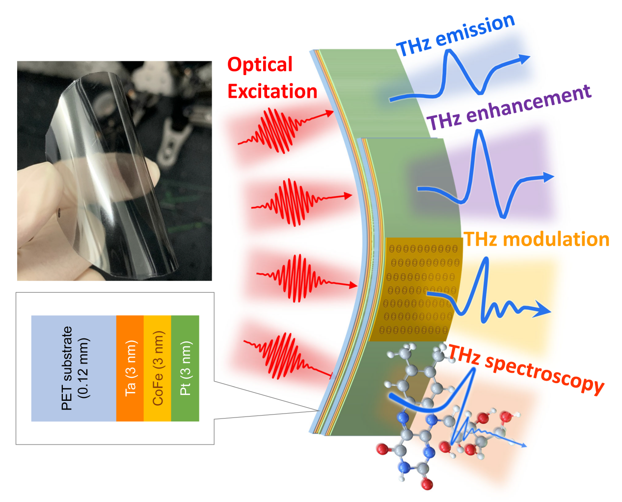 近日,beat365在线唯一官网光电学院庄松林院士领导的太赫兹技术创新研究院与复旦大学、上海大学、伍伦贡大学、莫斯科大学的科学家合作,研究了聚乙烯对苯二甲酸酯(PET)柔性衬底上制备的Pt/CoFe/Ta铁磁/非磁异质结构自旋光电子学太赫兹辐射源。研究发现,该柔性太赫兹辐射源具有发射效率高、稳定性好、成本低、偏振可调以及弯曲灵活等优点。重要的是,研究人员创新地提出基于该柔性PET/Pt/CoFe/Ta铁磁/非磁异质结构实现了级联太赫兹辐射源,不仅有效提高了太赫兹脉冲辐射的场强,而且可以通过与超构表面组合,有效地调控太赫兹脉冲辐射的时域波形。研究结果进一步表明,级联的自旋光电子学太赫兹辐射源完全适用于太赫兹时域光谱分析。研究人员认为,级联的柔性PET/STE可以作为基础模块,在太赫兹辐射的产生和调控方面展现较强的研究和应用价值,有望集成到未来的芯片级、紧凑型太赫兹器件和光谱系统中。