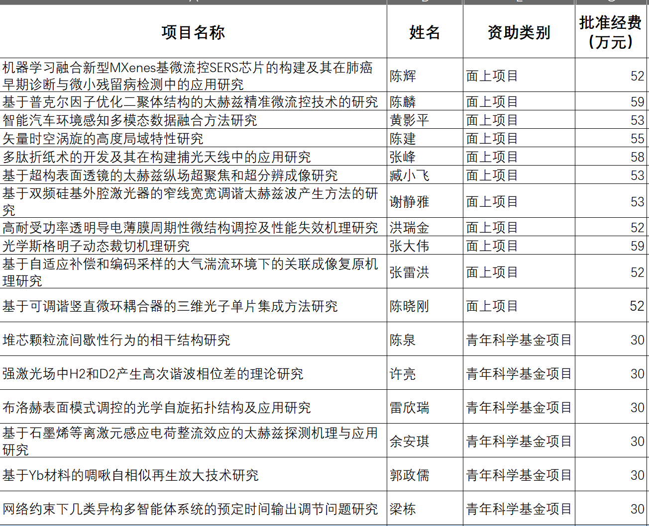 beat365在线唯一官网光电学院国家自然科学基金立项名单