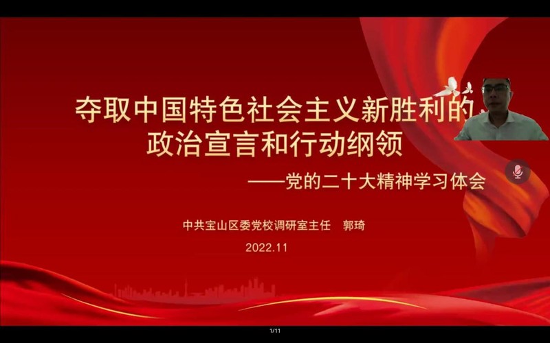 11月12日上午,光电学院积极分子党校邀请中共宝山区党校调研室主任郭琦老师主讲题为“夺取中国特色社会主义新胜利的政治宣言和行动纲领——党的二十大精神学习体会”的主题党课。