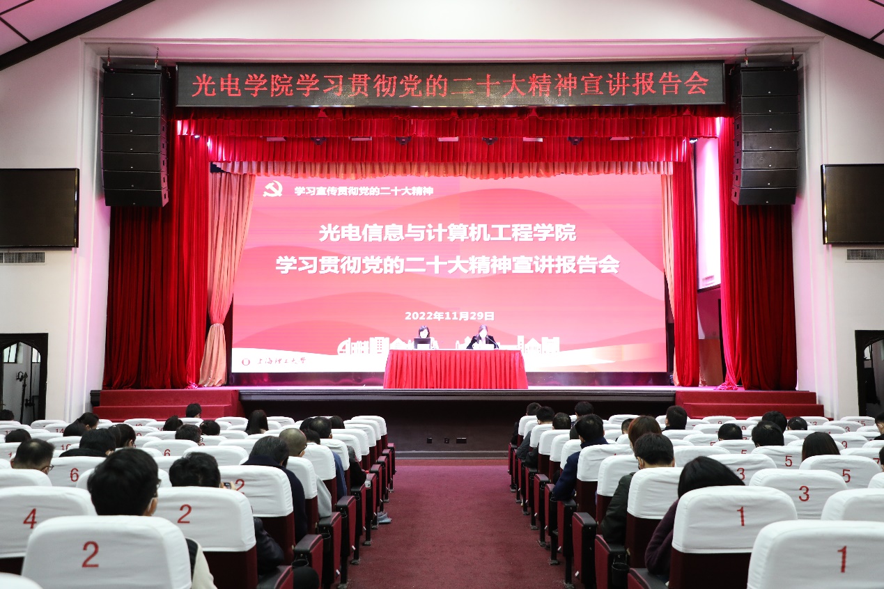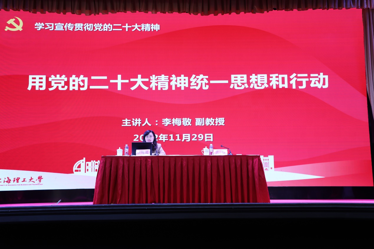 1129日下午在学校大礼堂,学院举行了学习宣传贯彻党的二十大精神宣讲报告会,学院教职工和部分学生党员300余名师生参加。马克思主义学院李梅敬副教授做了题为《用党的二十大精神统一思想和行动》的专题报告。报告会由学院党委书记袁媛主持。