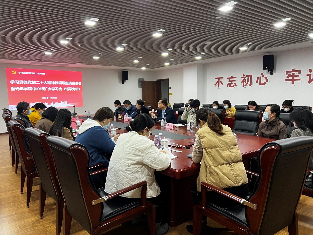 报告会后,学院在光电楼1042会议室召开了“学习贯彻党的二十大精神”校领导座谈宣讲会暨光电学院中心组扩大学习会(巡学旁听),副校长刘平出席并作座谈宣讲,宣传部副部长卢萧对学习会进行督导。学院党委中心组全体成员、教工支部书记参加了会议。
