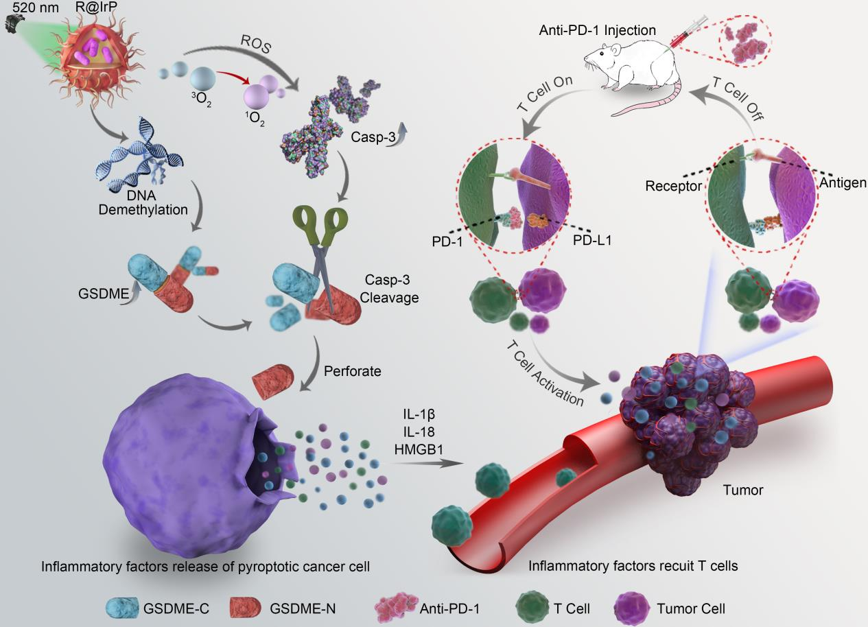 光动力治疗是众多肿瘤治疗手段之中最为有效的方法之一,其具有无创、毒副作用低等特点;而细胞焦亡作为程序性死亡方式之一,其与机体免疫系统的关系最为紧密,被广泛应用于肿瘤的免疫治疗。但是,黑色素瘤患者在其免疫微环境中缺乏淋巴细胞浸润,导致免疫增强类药物无法发挥其治疗效果,这种肿瘤被称为“冷肿瘤”。本研究结合光动力治疗以及细胞凋亡的原理,设计出一种以铱配合物为基质材料的纳米光敏剂IrP,该纳米材料能够在520nm激光的照射下刺激细胞产生大量的活性氧,诱导细胞焦亡相关蛋白Caspase-3的表达,同时利用IrP的自组装特性,进一步包覆去甲基化药物RG108,构建出光免疫纳米载药体系R@IrP,重构肿瘤部位的炎性微环境,促进机体的免疫细胞浸润到肿瘤部位,将黑色素瘤由“冷肿瘤”转换为“热肿瘤”,同时结合免疫检查点抑制剂anti-PD-1的协同治疗,发挥免疫检查点抑制剂的最大功效,其治疗效果提升了约95%,解决了免疫检查点抑制剂anti-PD-1在作用于“冷肿瘤”时失效的问题,为黑色素瘤的免疫治疗提供了一种无创的、高效的手段。