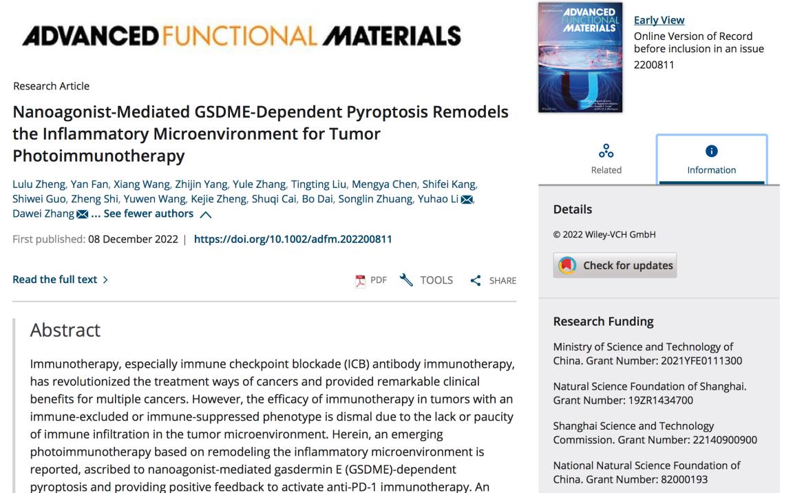近日,beat365在线唯一官网庄松林院士、国家级人才张大伟教授领导的超精密光学制造创新团队在国际高水平期刊《先进功能材料》《Advance Functional Materials》上发表了题为“光免疫介导的GSDME依赖的焦亡重塑肿瘤免疫微环境”(Nanoagonist-mediated GSDME dependent Pyroptosis Remodels the Inflammatory Microenvironment for Tumor Phot-oimmunotherapy)的重要突破成果,该成果和上海交通大学附属新华医院、长海医院合作,研究构建了一种新型的光免疫纳米材料载药体系,通过诱导癌细胞焦亡的方式引起肿瘤部位炎性微环境的改变,增强免疫浸润程度,激活机体免疫应答能力,并且解决免疫检查点抑制剂失效的问题,为黑色素瘤的治疗提供了一种新的方法。光电学院郑璐璐副教授,研究生范岩,材化学院研究生王翔为文章的共同第一作者,光电学院张大伟教授与材化学院李钰皓副教授为文章的通讯作者。该期刊是Wiley出版社旗下的国际材料科学领域最高层次综合性期刊之一,为Nature Index收录期刊,中科院JCR分区为一区,影响因子为19.924。期刊致力于报道材料科学取得的突破性进展,以其高质量的内容和高影响力而闻名,涉及领域包括纳米技术、化学、物理学和生物学。
