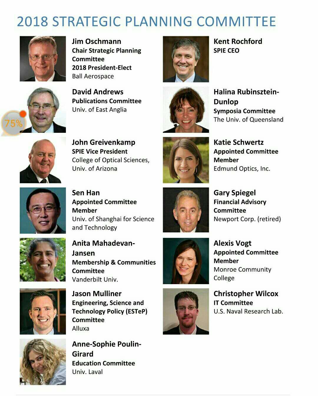 国际光学工程学会(SPIE)是一家致力于光学和光子学的非营利国际学术组织。自1955年成立以来,吸引了来自全球184个国家超过25.8万名会员并为之服务。会员的集体才能和奉献精神使学会成为科学和工程界的一支强大力量。SPIE由一个敬业的志愿者团队领导,该领导团队包括董事会(CEO、President、CFO等)、多个委员会、会议主席和期刊编辑,其使命是与研究人员、教育工作者和工业界合作,推进基于光的研究和技术,以改善人类状况。beat365在线唯一官网庄松林院士团队的韩森教授既为SPIE Fellow,也作为领导团体成员之一,兼任战略筹划委员会成员、计量奖评审人、会议主席、学生分会顾问,与团队其他领导成员一起,致力于SPIE团队的建设,传承SPIE精神,为SPIE的更好发展作出贡献。