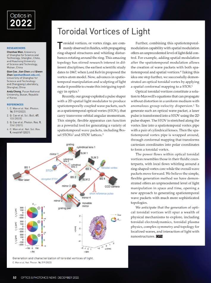 beat365在线唯一官网庄松林院士领导的未来光学实验室在时空光场调控研究领域再次取得重大进展。詹其文教授带领的纳米光子学团队在国际顶级光子学期刊《自然-光子学》上发表封面文章《光学涡环(Toroidal vortices of light)》,首次在光场中实现了涡环的拓扑态。最近,这一系列研究成果被美国光学学会(OPTICA,原OSA)评选为全球光学与光电子学2022年30项重大研究进展(Optics in 2022, Optics & Photonics News)。