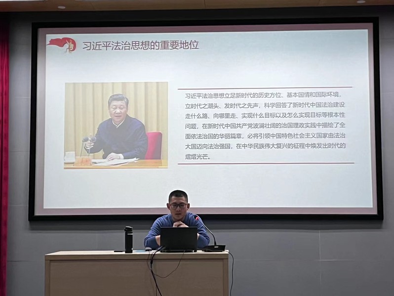 靖鑫主要从习近平法治思想的形成背景,重要地位以及主要内容三个方面展开,为同学们介绍了什么是习近平法制思想。生动细致地讲解了习近平法治思想地重要地位,表示习近平法治思想立足新时代的历史方位、基本国情和国际环境,立时代之潮头,发时代之先声。最后,老师强调到:党法关系是一种相互依赖、高度统一的关系,虽然法的制定离不开党的领导,但是这不意味着党员们可以违反法律,相反作为一名共产党员更要带头遵纪守法。