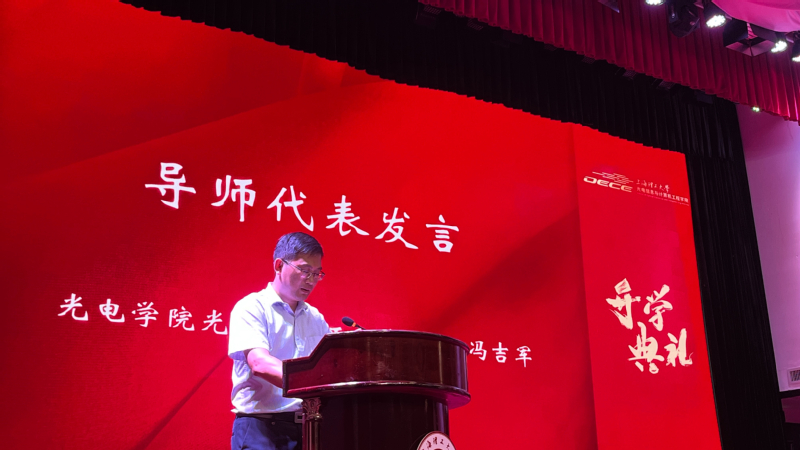 学院光电信息工程系教师冯吉军作为导师代表发言,他谈到,近年来学院着力打造的师生共同体、科创联合体和行业协作体为同学们提供了良好的学术科研环境和平台。作为新一届研究生,从今天开始,同学们前行的道路上将面临新的坎坷和挑战,这段旅途将充满未知、充满挑战,但也将充满机会和成长。这不仅是一条充满未知与艰辛的求学之路,也是一条实现远大理想的自我之路。只要同学们积极探索,在坚持不懈中守正创新,必定攀登上属于大家的科研高峰!