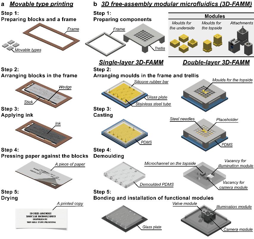 本研究受活字印刷术的启发,提出了一种3D模块化微流控(3D-FAMM)制造技术,为各种微流体控制模具以及各类功能性器件(阀门、照明光源、显微相机)制定了模块化标准。通过倒模复刻已组装的模具,可制造出复杂结构的微流控系统。研究中,利用3D-FAMM系统演示了多种应用,包括生成复杂浓度梯度,生成和操控微液滴,以及捕获和共培养细胞。3D-FAMM技术可以快速制造出各种微流控系统的原型样件,构建片上研究平台,实现高效的概念验证或产品开发阶段的测试及小批量制造。3D-FAMM技术功能性强、灵活性高,在生命科学领域具有广阔的应用前景。
