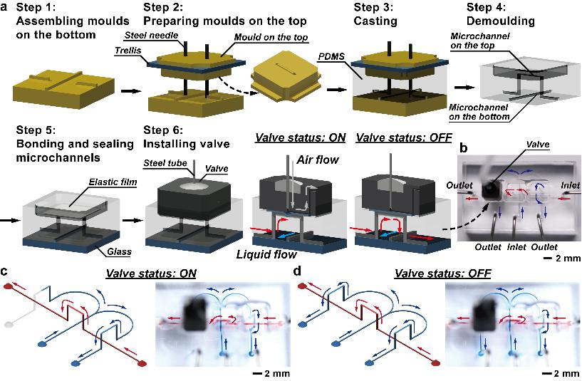 模块化微流控制造技术通过组装各种预制的模块,拼搭出整个微流控系统。近些年,各种模块制造技术及模块组装技术被提出。模块的制造可以通过在晶圆上制备多种微结构,再用类似聚二甲基硅氧烷(PDMS)的弹性材料复刻出模块结构。这些模块可以通过粘接灵活地组装成一个完整的系统。此外,微流控模块也可以利用3D打印制造,然而,同时满足高打印分辨率、高表面光滑度,以及采用具有生物化学相容性和高度光学透过率的打印材料,对于3D打印技术是一个巨大的挑战。使用3D打印模具或铝模具复制PDMS模块提供了折中的解决方案。但是,反复制造一次性PDMS模块效率较低,无法满足小批量生产的需求。此外,研究人员提出了改造注塑模块(如乐高组件)的方案,但该方案较难实现3D结构,且实现几十微米的改造精度也存在难度。除了以上提及的难处,现有的模块化微流控技术难以将功能器件标准化,实现一体化微流控系统。