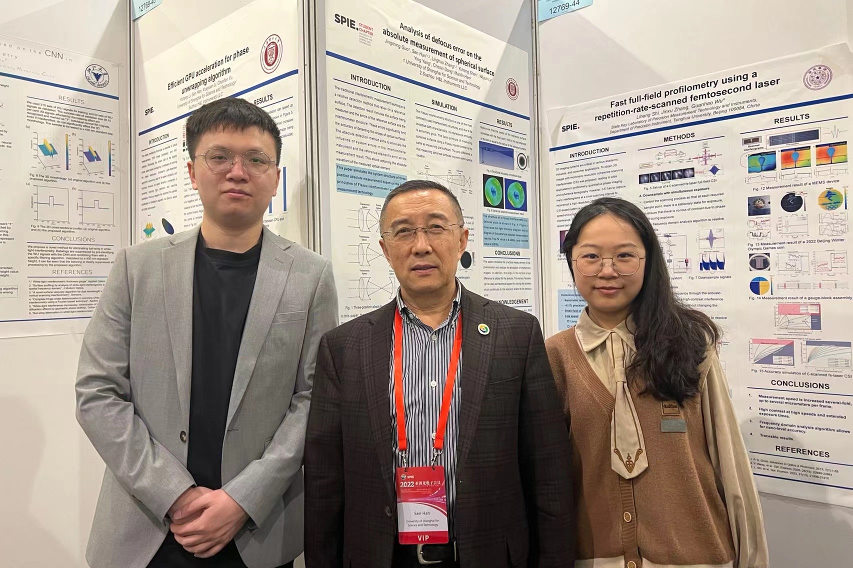 SPIE上理学生分会海报展示(左起:沈宇航同学、韩森教授、杨颖同学)