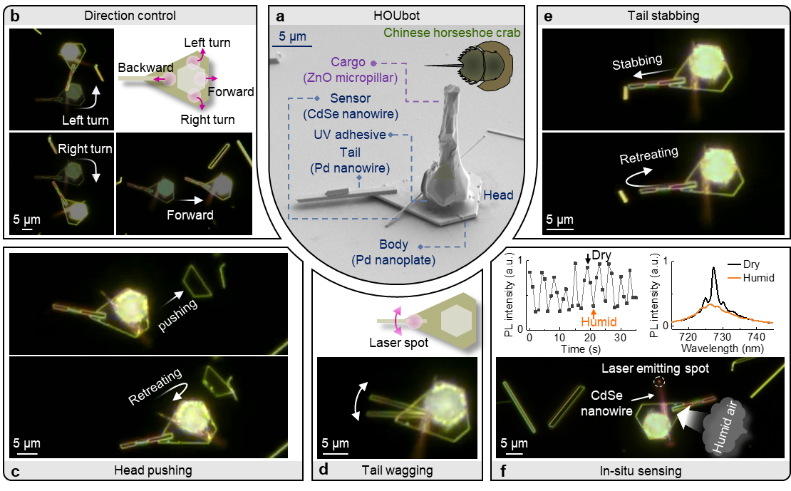 图4复杂的纳米机器人HOUbot。 (a) HOUbot的SEM图,插图为中国鲎。 (b)自由运动控制。 (c)头部推动。 (d和e)独立尾部摆动和戳刺。 (f)原位湿度传感。