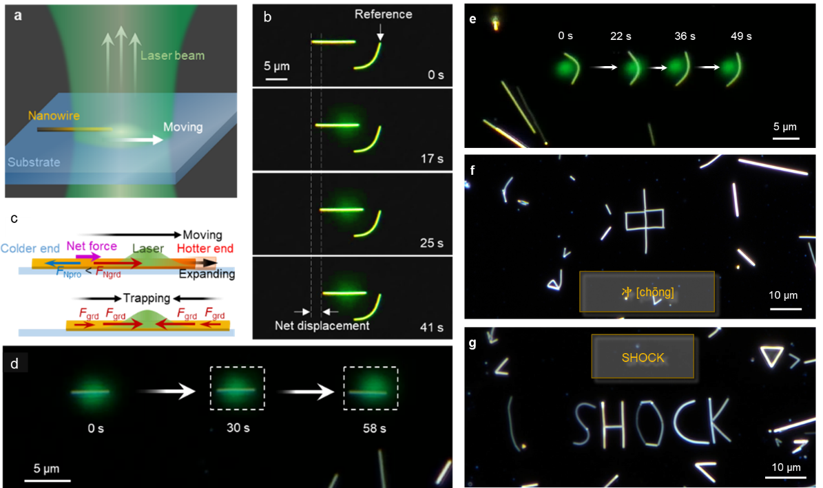 捕获(Trapping)特性是激光操控技术的核心,因为它可以通过光斑位置来掌握粒子的动向,实现任意的运动控制,而不仅仅止步于缺乏控制的致动(Actuation)。如图3a和3b所示,金纳米线在532nm纳秒脉冲的高斯型光斑作用下,会向光斑内部移动,直到纳米线的中心与光斑中心一致,这是一个典型的捕获过程(见视频)。研究人员通过理论分析,找到了光热冲击驱动力的物理来源,因表达式中包含温度梯度,因此该力被称为光热梯度力。当移动光斑时,光热梯度力分布平衡被打破,纳米线重新向光斑中心移动,一直重复该过程,纳米线就会随着光斑一直轴向移动(图3d)。另外对被捕获在光斑中央的纳米线,提高激光功率将会使纳米线两端受到更大光热梯度力挤压而侧向弯曲,从而实现侧向移动(图3e)。这样就实现了纳米线在二维平面上的任意运动。图3f和3g展示了研究团队将多根纳米线拼成汉字“冲”和英文单词“SHOCK”的图案。