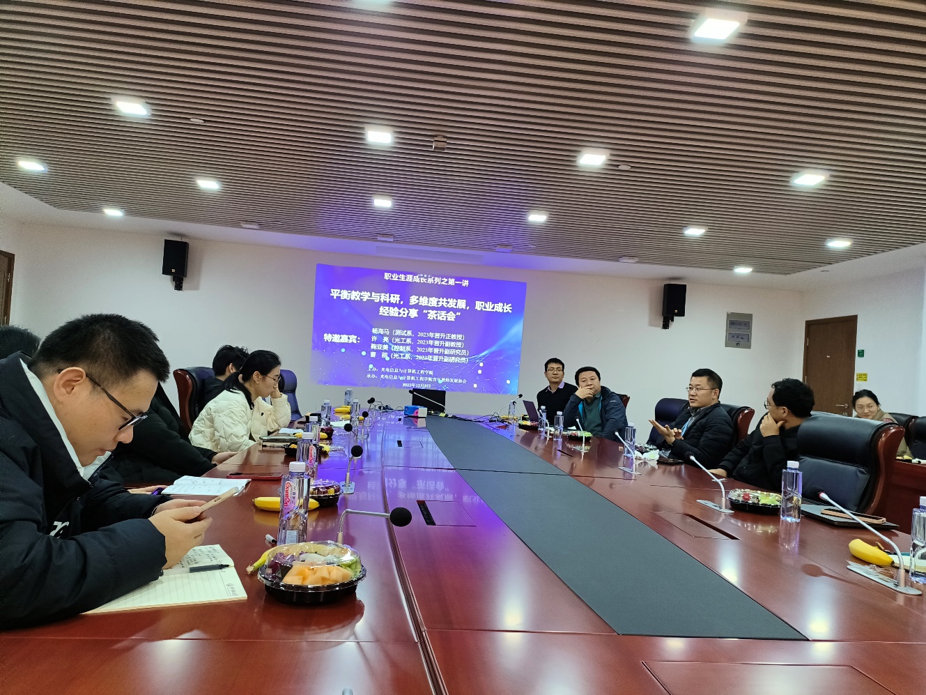 12月8日下午,在光电学院1042会议室,光电学院青年教师发展协会邀请本年度“不同序列”成功晋升职称的教师们与协会青年教师一起,举办了职业生涯成长系列“个人经验”分享与交流座谈茶话会活动。本次活动由光电学院主办、学院青年教师发展协会承办,会议主题明确而贴合青年教师们的实际需求,让参会青年教师能够在轻松自在的氛围内畅所欲言、“问”之有序、言之成理、尚理“成长”。副院长刘鹏参加茶话会,茶话会由协会会长禹德朝主持。