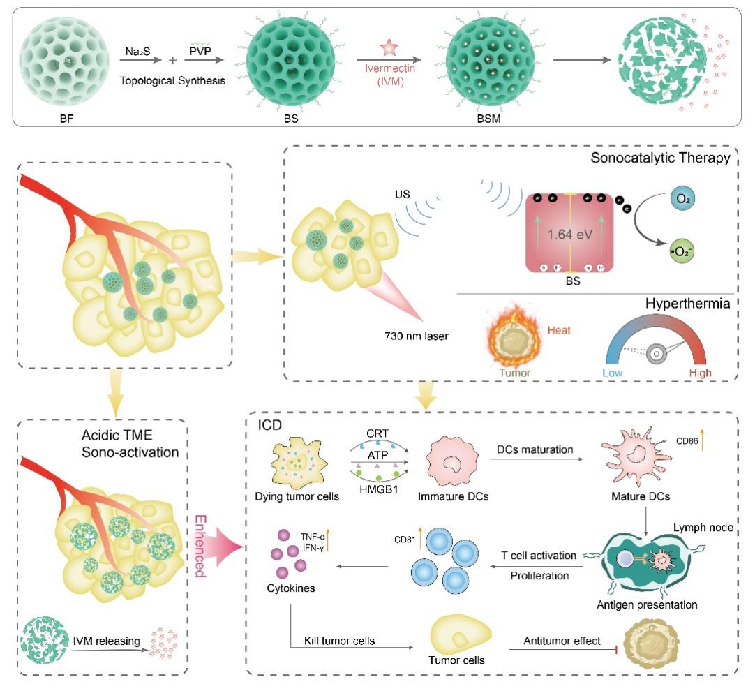 近日,beat365在线唯一官网庄松林院士、张大伟教授领导的超精密光学制造创新团队通过拓扑合成策略将宽带隙的氟化铋纳米材料调控为一种窄带隙的硫掺杂氧化铋纳米材料,用于免疫原性细胞死亡介导的肿瘤免疫治疗。研究结果表明,超声刺激下硫掺杂氧化铋纳米材料具有更高的电子-空穴分离效率,可以产生更多的活性氧物种;硫元素的掺杂能够扩展其光吸收范围,使其在730纳米的光照下具有良好的光热转换性能;释放的铋离子将会与肿瘤微环境中过表达的谷胱甘肽反应,放大肿瘤细胞的氧化应激;利用其介孔结构装载伊维菌素药物,进一步增强肿瘤细胞的免疫原性死亡,最终实现更加有效的免疫应答。